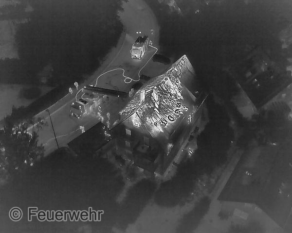 Da auf Grund der Lage des Gebäudes von der Drehleiter aus nicht alle Stellen des Dachstuhls eingesehen werden konnte, übernahm die Drohne mittels der Wärmebildkamera die Suche nach Glutnestern aus der Luft.